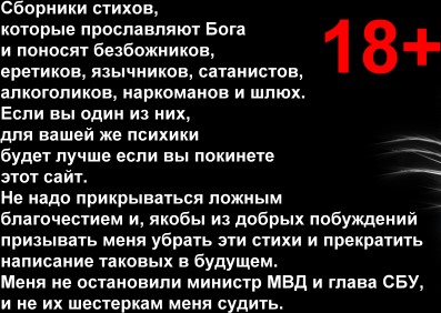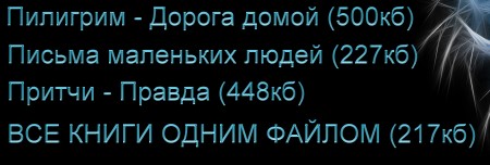 Пилигрим: Дорога домой = Ссылка 2 Письма маленьких людей = Ссылка 2 Притчи - Правда = Ссылка 2 ВСЕ КНИГИ ОДНИМ ФАЙЛОМ = Ссылка 2 © Как вы понимаете, все права принадлежат мне. А это уже сторонние авторы: Апокалипсис демократии (1.5 мб) Книга христианина (2.8 мб) Большое Американское Шоу (видео 43.7 мб)